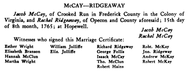 [Home] [Partial Genealogy Records]Jacob McKay RecordJacob McKay, born: 1738; Frederick Co. VA; died: 1817; Belmont Co. OH; See his Find A Grave entry. Jacob, married: 15 Aug 1765; Hopewell MM, Frederick Co. VA; Rachel Ridgeway, born: ca. 1739; NJ; died: before 1784; Dau. of John Ridgeway & Hannah Brown; See her Find A Grave entry. From Hopewell Friends History, p. 246 we find a transcribed copy of their marriage certificate: ![]() These are the webmaster's ancestors. See Jacob's Last Will and Testament. Issue: McKay