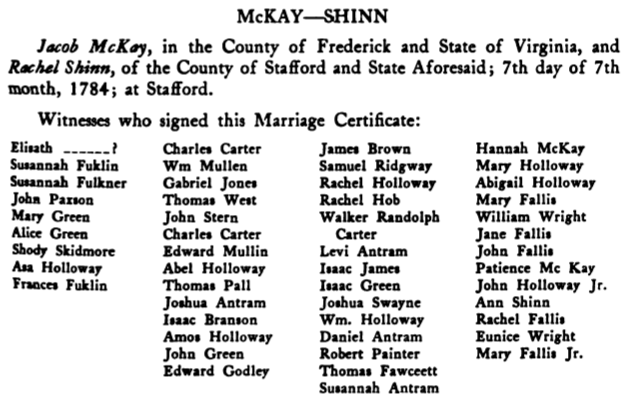 Jacob, married 2nd: 7 Jul 1784; Stafford MM, Stafford Co. VA; Rachel Wright, Dau. of Samuel & Rachel (Kirby) Wright; See her Find A Grave entry. From Hopewell Friends History, p. 377 we find a transcribed copy of their marriage certificate: ![]() Jacob, married 3rd: 28 Jun 1802; Goose Creek MM, Loudoun Co. VA; Rebecca Janney, Dau. of John & Hannah (Ingledue) Janney; See her Find A Grave entry. Source info: A Tabulated Genealogy of the Family of Robert and Ann (Brown) Mackay Sr. (by Dee Ann Buck), p. 33, 69-74; |