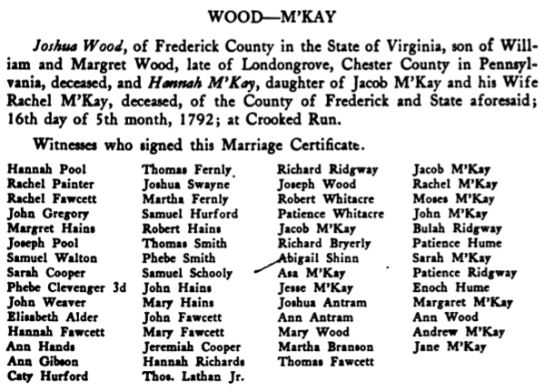[Home] [Partial Genealogy Records]Hannah McKay RecordHannah McKay, born: ca. 1770; Frederick Co. VA; died: Belmont Co. OH; Hannah, married: 15 5mo 1792; Crooked Run Meeting House, Frederick (now Warren) Co. VA; Joshua Wood, born: 5 7mo 1763; died: 1848; Belmont Co. OH; Son of William & Margaret Wood; From Hopewell Friends History, p. 393 we find a transcribed copy of their marriage certificate: ![]() All their children were born in Frederick Co. VA. Issue: Wood
