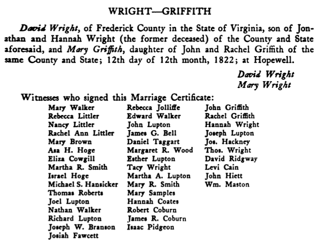 [Home] [Partial Genealogy Records]David Wright RecordDavid Wright, born: 31 Jul 1797; died: Apple Pie Ridge, Frederick Co. VA; David, married: 12 12mo 1822; Hopewell MM, Frederick Co. VA; Mary Griffith, dau. of John Griffith and Rachel Hackney of Frederick Co. VA; From Hopewell Friends History, p. 357 we find a transcribed copy of their marriage certificate: ![]() Unknown if they had any issue. Source info: "A Tabulated Genealogy of the Family of Robert & Ann (Brown) Mackay Sr. (1990)" by Dee Ann Buck, p. 80; Hopewell Friends History, p.357 (Marriage Cert.); |