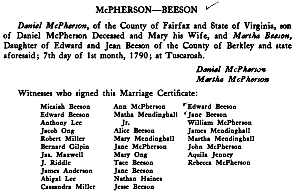 [Home] [Partial Genealogy Records]Martha Beeson RecordMartha Beeson, born: 16 9mo 1771; Berkeley Co. VA (now WV); died: 14 12mo 1854; OH; buried: Hightop Cem., Highland Co. OH; dau. of Edward Beeson & Jean Pugh; See her Find A Grave entry. Martha, married: 7 1mo 1790; Tuscarora Meeting, Frederick Co. VA (now Berkeley Co. WV); Daniel McPherson, son of Daniel and Mary McPherson; From Hopewell Friends History, p. 295 we find a transcribed copy of their marriage certificate: ![]() Issue: McPherson