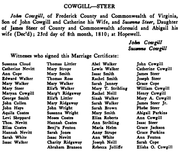 [Home] [Partial Genealogy Records]Susannah Steer RecordSusannah Steer, born: ca. 1781; VA; died: 27 5mo 1863; Susannah, married: 23 8mo 1810; Hopewell MM, Frederick Co. VA; John Cowgill, Son of John and Catherine Cowgill; From Hopewell Friends History, p. 339 we find a transcribed copy of their marriage certificate: ![]() Both were living in Frederick Co. Va. at the time of marriage. According to Hinshaw's Quaker records, "John Jr. and wife Susannah, & son James were granted a certificate to Center MM in Ohio" from Hopewell MM. Issue: Cowgill