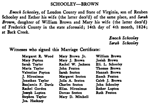 [Home] [Partial Genealogy Records]Sarah Brown RecordSarah Brown, born: 1802; Frederick Co. VA; died: 20 9mo 1826; Loudoun Co. VA; Sarah, married: 14 4mo 1824; Back Creek Meeting, Gainesboro, VA; Enoch Schooley, born: 28 11mo 1792; Loudoun Co. VA; died: 21 9mo 1826; Loudoun Co. VA; Son of Reuben & Esther Schooley; From Hopewell Friends History, p. 359 we find a transcribed copy of their marriage certificate: ![]() No issue. Source info: Steer Genealogy, p. 8; Encyclopedia of American Quaker Genealogy, Vol VI (Hopewell MM) p. 373, 406, 442, #1(371); Hopewell Friends History, p. 359 (marriage cert.); |