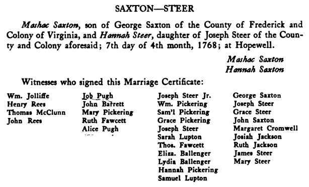 [Home] [Partial Genealogy Records]Hannah Steer RecordHannah Steer, born: 25 1mo 1749; Lancaster Co. PA; Hannah, married: 7 4mo 1768; Hopewell MM, Frederick Co. VA; Meshach Saxton, Son of George Saxton; From Hopewell Friends History, p. 249 we find a transcribed copy of their marriage certificate: ![]() According to Hopewell Friends History & Hinshaw's Quaker records Meshach was "received by request" into Hopewell MM on 6 7mo 1767 (Hinshaw has 3 8mo 1767). Also from Hinshaw's records & Hopewell Friends, Hannah & her daughters Hannah & Mary were "received on a certificate from" Crooked Run MM dated 4 4mo 1795 into Hopewell MM on 7 12mo 1795. Hannah & chn. Catherine, Hannah & Mary were "granted a certificate to" Westland MM on 4 5mo 1801 from Hopewell MM. She removed with her husband. Meshach was listed as a Committee Member for Hopewell MM within the period 1777-1791. Issue: Sexton (Spelling of surname was changed)