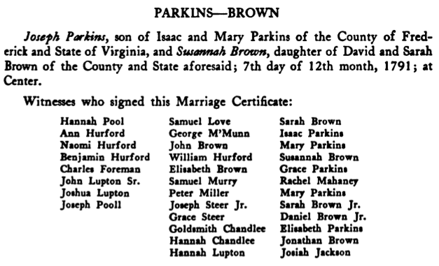 [Home] [Partial Genealogy Records]Joseph Parkins RecordJoseph Parkins, born: 22 7mo 1771; Frederick Co. VA; died: 16 12mo 1800; Frederick Co. VA; buried: Hollingsworth, Parkins, Henrys Cem., Frederick Co. VA; Joseph, married: 7 12mo 1791; Centre Meeting, Frederick Co. VA; Susannah Brown, born: 29 6mo 1771; died: 7 3mo 1847; Paris, TN; Dau. of David Brown and Sarah Hite; From Hopewell Friends History, p. 391 we find a transcribed copy of their marriage certificate: ![]() Susannah is a descendant of Cretien DuBois who begins the DuBois Family section of my records which has not been added yet through this line: Susannah Brown -> Sarah Hite -> Sarah Eltinge (who m. Col. Jno. Hite (son of Joist Hite)) -> Rebecca Van Meter -> Sarah Du Bois -> Louis DuBois -> Cretien DuBois. Joist Hite, together with Robert Mackay, William Green, and Robert Duff had a dispute over land against Lord Fairfax which resulted in the Fairfax Land Suit. The books pertaining to the land suit can be found in the Library at Lord Fairfax Community College. At the time of her 1st marriage Susannah was living in Frederick Co. Va. Issue: Parkins