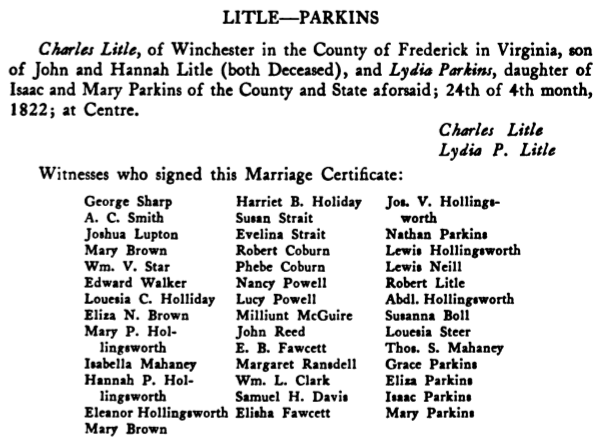 [Home] [Partial Genealogy Records]Lydia Parkins RecordLydia Parkins, born: 14 4mo 1794; Frederick Co. VA; died: 21 5mo (or 23 6mo) 1872; "Brookland", Frederick Co. VA; buried: Hollingsworth, Parkins, Henrys Cem., Frederick Co. VA; Lydia, married: 24 4mo 1822; Centre Meeting, Frederick Co. VA; Charles Lytle (or Litler), born: 16 2mo 1796; Alexandria, VA; died: 16 or 23 2mo 1839; Washington, DC; Son of John and Hannah Lytle; From Hopewell Friends History, p. 356 we find a transcribed copy of their marriage certificate: ![]() Lydia's will was executed by Aaron H. Griffith. According to Hinshaw's Quaker records Charles was "recieved on a certificate from" Baltimore MM for western district dated 7 12mo 1821 into Hopewell MM on 7 3mo 1822. He, Lydia and chn. William & Isaac P. were "granted a certificate to" Alexandria MM on 5 10mo 1826 from Hopewell MM. Lydia and chn. Nathan & Sidney were "recieved on a certificate from" Alexandria MM dated 18 6mo 1840 into Hopewell MM on 8 10mo 1840. Lydia was "granted a certificate to" Fairfax MM on 4 5mo 1871 from Hopewell MM. Issue: Lytle