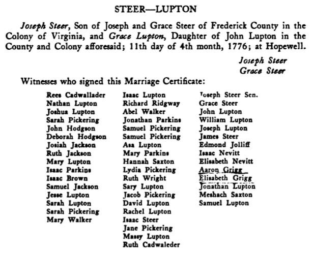 [Home] [Partial Genealogy Records]Joseph Steer RecordJoseph Steer, born: 26 12mo 1754; Lancaster Co. PA; died: 23 8mo 1840; Jefferson Co. OH; Joseph, married: 11 4mo 1776; Hopewell MM, Frederick Co. VA; Grace Lupton, born: 9 6mo 1758 (Hinshaw says 1757); Frederick Co. VA; died: 13 4mo 1819; Jefferson Co. OH; Dau. of John Lupton and Sarah Frost; From Hopewell Friends History, p. 263 we find a transcribed copy of their marriage certificate: ![]() According to Hopewell Friends History & Hinshaw's Quaker records Joseph & Grace & chn. Isaac, Sarah, Joshua & David were "recieved on a certificate from" Crooked Run MM dated 31 5mo 1788 into Hopewell MM on 7 7mo 1788. Also, from Hinshaw's records & Hopewell Friends, Joseph & Grace & four of their chn. David, Rachel, Samuel, & Amos, were "granted a certificate to" Concord MM, Ohio on 5 3mo 1804 from Hopewell MM. Joseph was listed as a clerk for Hopewell MM. He was also listed as an overseer within the period 1759-1851 for Centre Mtg & Ridge Mtg. Joseph was listed as a Committee Member for Hopewell MM within the period 1777-1791 & 1791-1811. He was listed as a Special Committee Member for Hopewell MM within the period 1791-1811 to look after the "Education and Care of Our Youth". He was appointed on 12 7mo 1801. All chn. of above were born in Frederick Co. Va. Issue: Steer