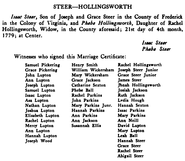 [Home] [Partial Genealogy Records]Isaac Steer RecordIsaac Steer, born: 6 12mo 1757; Frederick Co. VA; died: 24 8mo 1844; Loudoun Co. VA; buried: Fairfax MM Burial Ground, Waterford, Loudoun Co. VA; See his Find A Grave entry. Isaac, married: 21 4mo 1779; Centre Meeting House, Frederick Co. VA (Evidently Centre means Winchester Meeting, formerly Friendly Grove.); Phebe Hollingsworth, born: 20 3mo 1757; Frederick Co. VA; died: 25 11mo 1822; Loudoun Co. VA; See her Find A Grave entry. These are the webmaster's ancestors. From Hopewell Friends History, p. 268 we find a transcribed copy of their marriage certificate: ![]() An article in an old newspaper tells of his selling of 213 acres of land northwest of Winchester is in my possession dated 13 5mo 1801. This is probably referring to the selling of "Long Green", the ancestral home. According to Hopewell Friends History & Hinshaw's Quaker records Phebe along with her mother and sister Mary were "recieved on a certificate from Fairfax MM dated 27 4mo 1776" into Hopewell MM on 6 5mo 1776. Also, from Hinshaw's records & Hopewell Friends History, Isaac & Phebe & daughter Mary were "recieved on a certificate from" Crooked Run MM dated 4 1mo 1783 into Hopewell on 3 2mo 1783, and Isaac & Phebe & chn. Joseph, Ann, Jonah, Lydia, William, Rachel, & Phebe were "granted a certificate to" Fairfax MM on 3 5mo 1802 from Hopewell MM. Isaac & Phebe were listed as elders of Hopewell MM. Phebe was listed as a clerk for the Women's Mtg. of Hopewell MM. Isaac was listed as an Overseer for Hopewell MM within the period 1759-1851. He was also listed as a Committee Member for Hopewell MM within the period 1791-1811. All chn. of above were born in Frederick Co. VA except Rachel and Phebe, they were born in Loudoun Co. VA. Issue: Steer