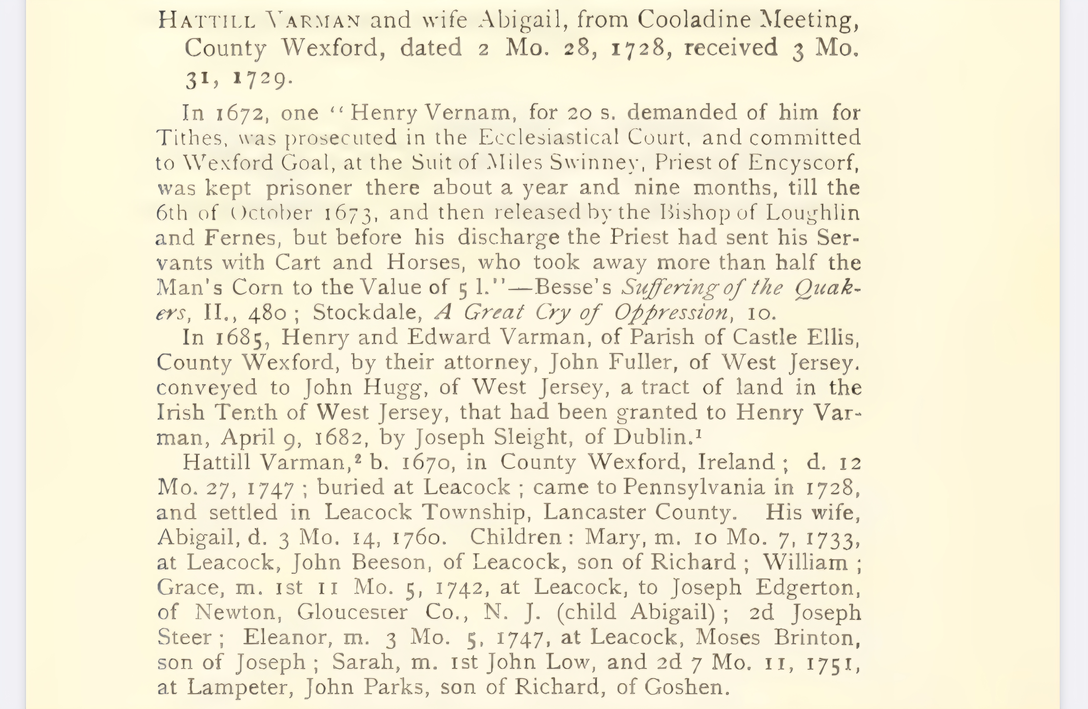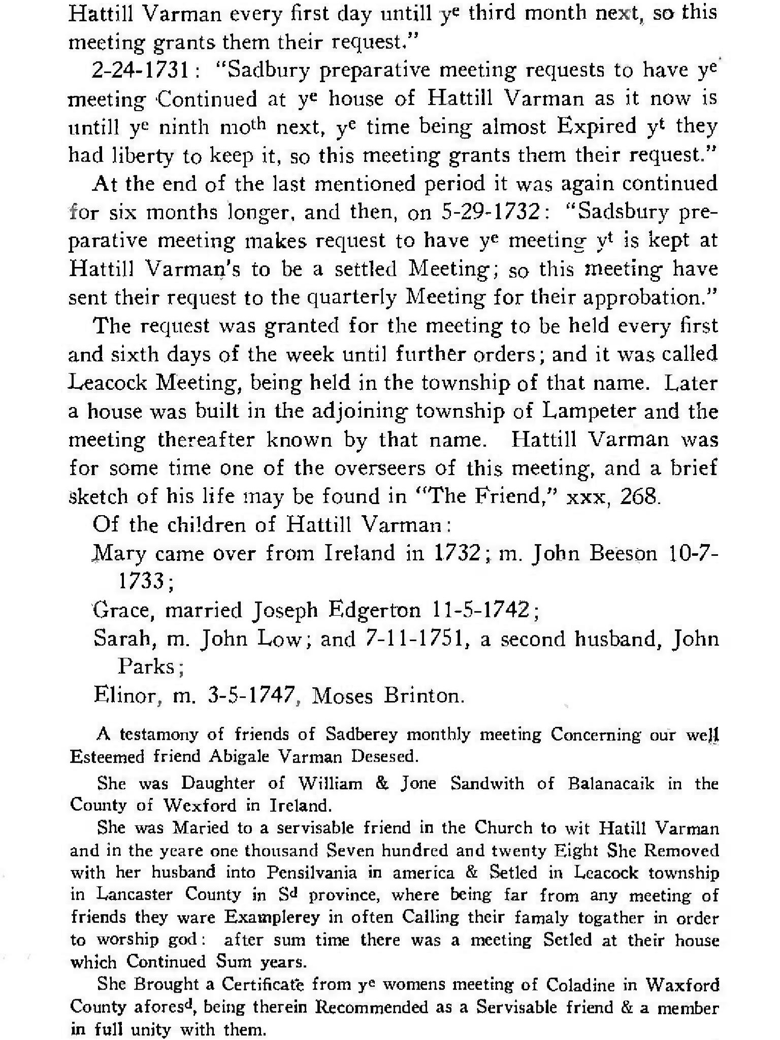 [Home] [Partial Genealogy Records]Hattill Varman RecordHattill Varman, born: 3 4mo 1672; Co. Wexford, Ireland; died: 27 12mo 1747; buried: Leacock MM Cem., Lancaster Co. PA; See his Find A Grave entry. Hattill, married: 19 7mo 1700; Lambstown, Co. Wexford, Ireland; Grace Sparrow, died: 20 9mo 1704; See her Find A Grave entry. He was living in Askasillagh, Co. Wexford, Ireland and she was living in Ballywaddor, Co. Wexford, Ireland at the time of marriage. Issue: Varman