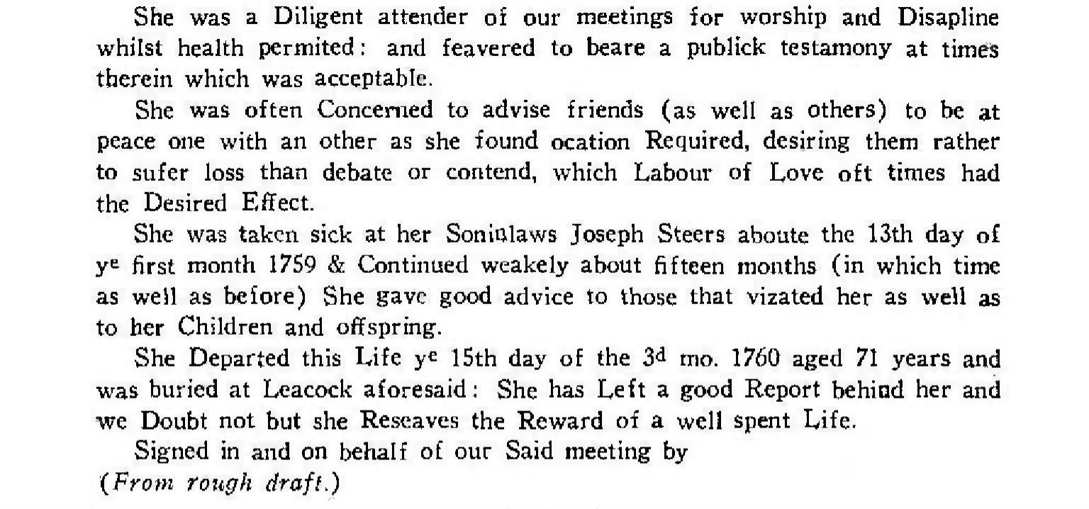 Source info: Steer Genealogy, p. 2; Immigration of the Irish Quakers into Pennsylvania, p. 160, 161, 343 (#1), 344 (#1), 353 (see biog. info.); Quaker Marriage Certificates, New Garden MM, p. 59 (#1 Marriage Cert.); The Descendants of David Steere & Phebe Milhous, p.iii; The Brinton Genealogy (by Janetta Wright Schoonover), pages 162-165; |