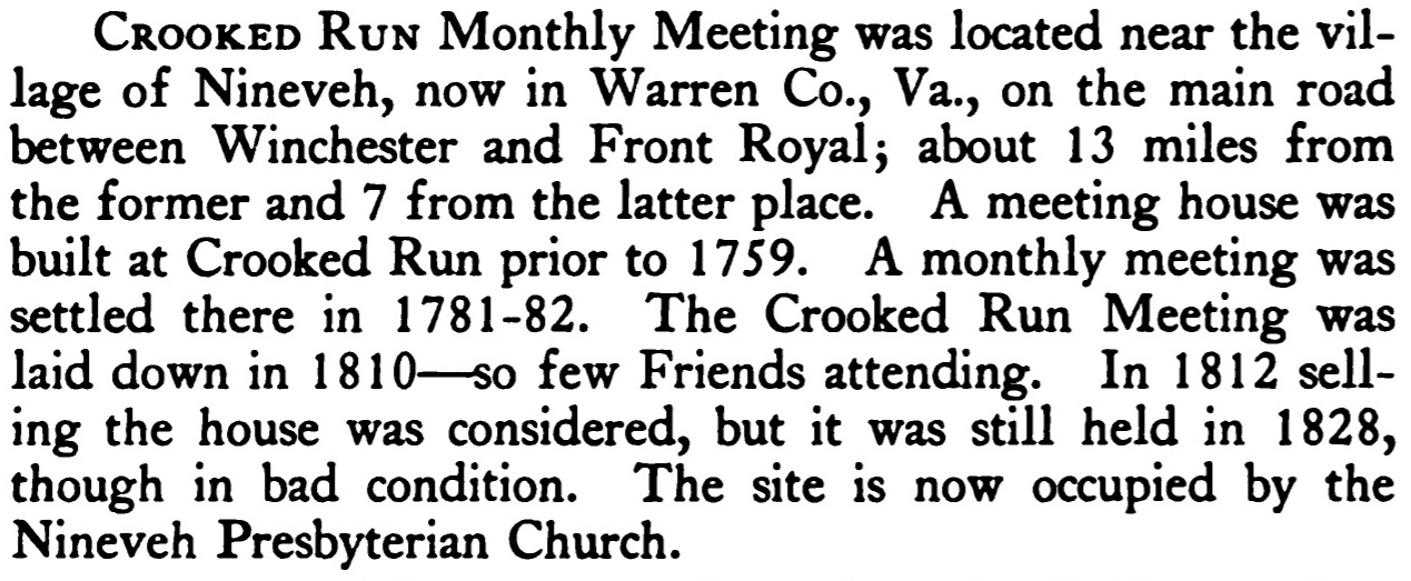 Nineveh Presbyterian Church now occupies the location where Crooked Run Meeting House once stood.