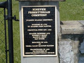 Inscription reads: NINEVEH (FORMER QUAKER CEMETERY) FOUNDED IN 1758 PERPETUAL FUND EST. 1962 QUAKER TRUSTEES 1973 ENDOWED IN 1975 TRANSFERRED IN 1989 |