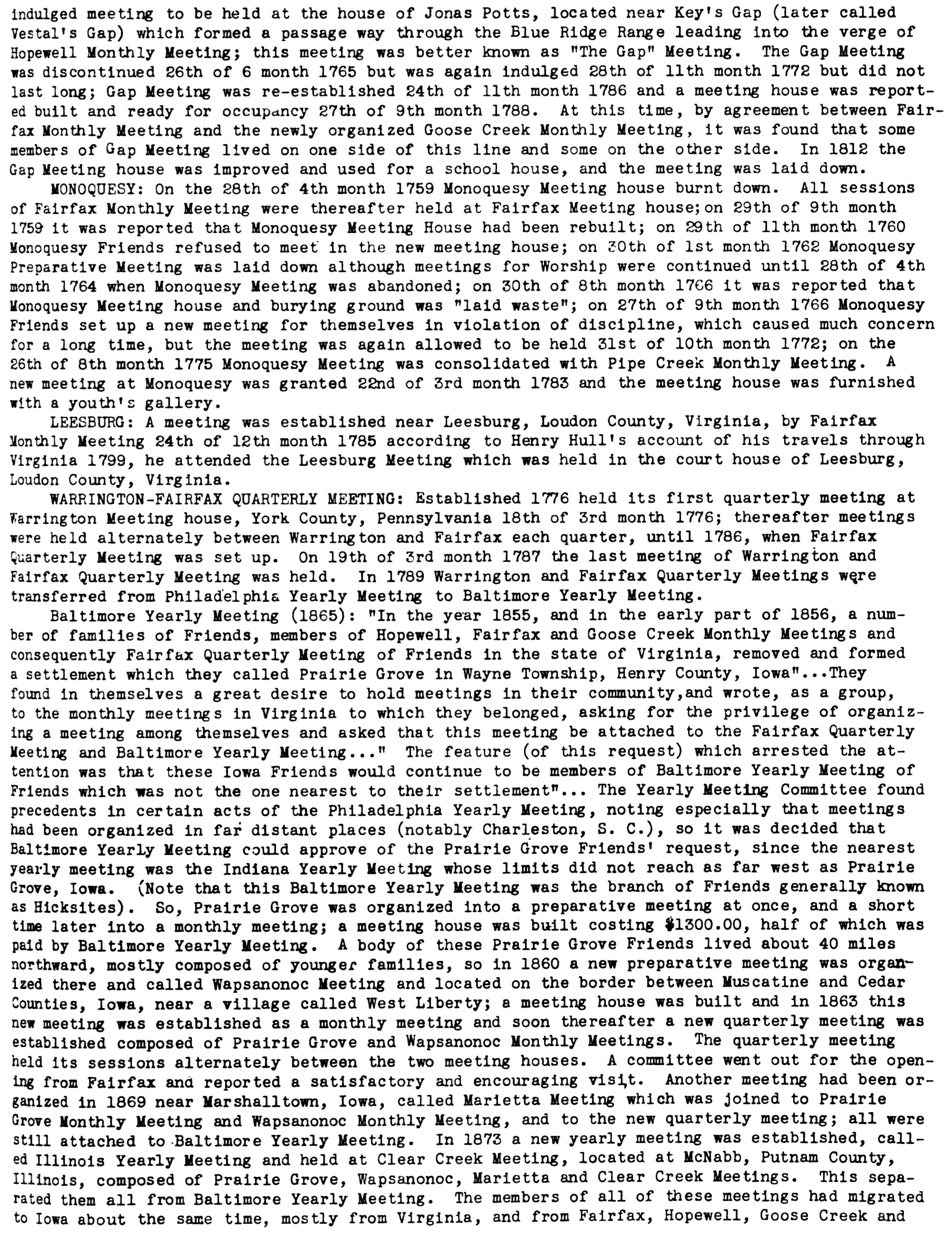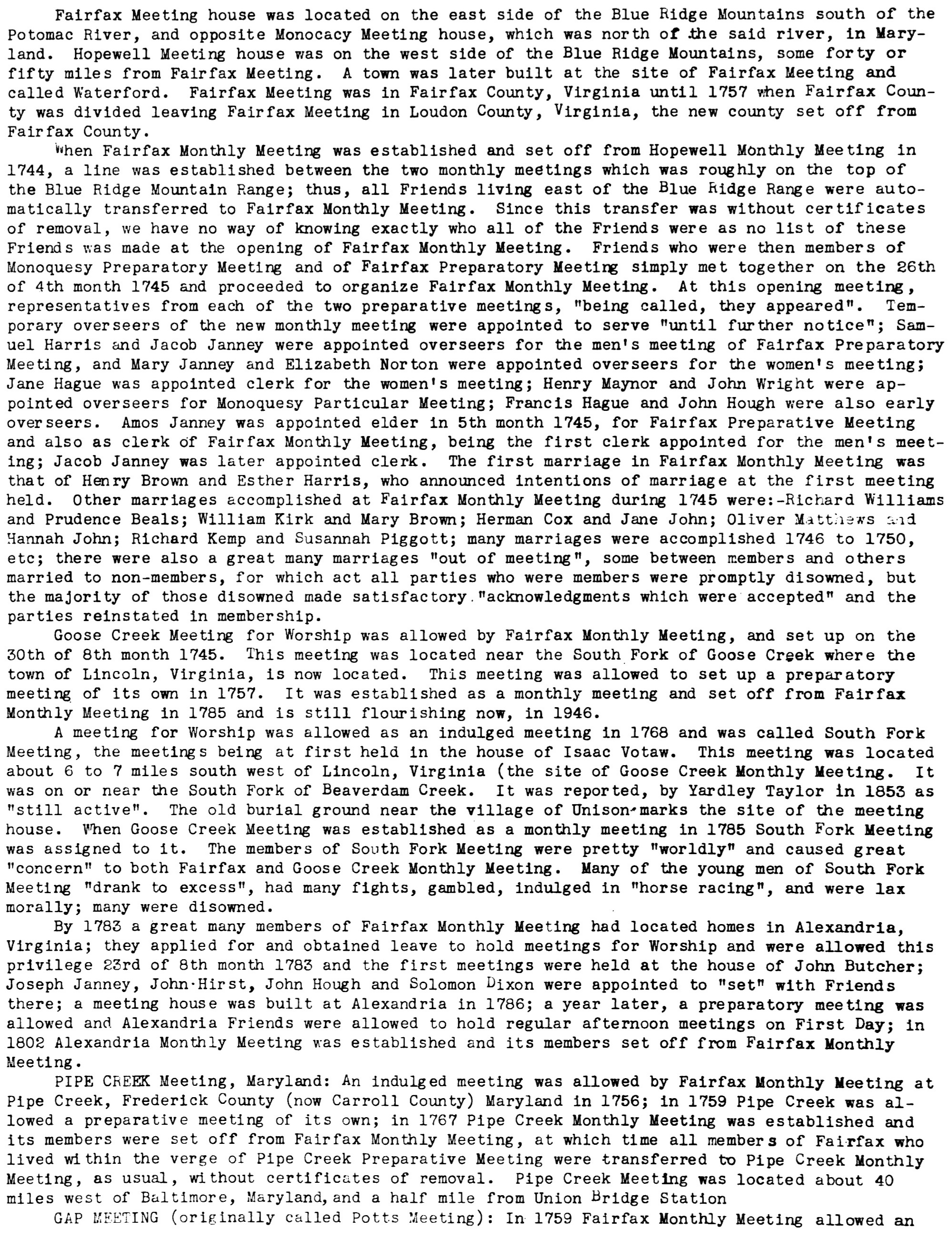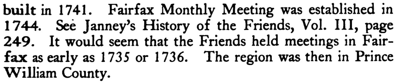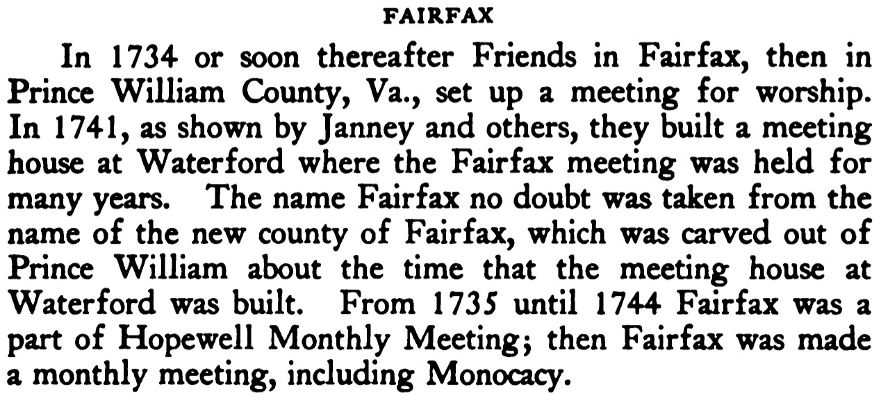 [Home] [Quaker Meetings in the Lower Shenandoah Valley and elsewhere]Fairfax (Waterford) Monthly MeetingLocated on the eastern side of Waterford, Loudoun Co. Va. on Old Waterford Road. It is now a private residence. The adjoining graveyard is still intact and contains the graves of many who once worshipped there including Isaac Steer (who married Phoebe Hollingsworth). After the laying down of Fairfax Meeting, the members of the meeting had their memberships transferred to Goose Creek Monthly Meeting. Below are some excerpts from "Hopewell Friends History" and William Wade Hinshaw's "Encyclopedia of American Quaker Genealogy" about Fairfax Meeting. Hopewell Friends Historyp. 70; Meetings Within The Verge Of Hopewell