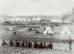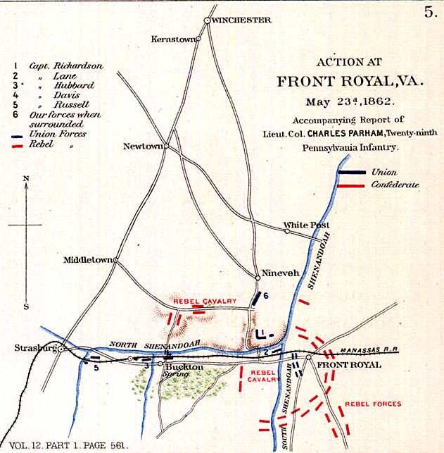 When the charge was commenced their cavalry took to flight. The two pieces of artillery were abandoned and taken with nearly the entire infantry force taken prisoner. Southern Historical Society Papers (FIGHT AT FRONT ROYAL) Diary of John C. Donohoe, Hughesville, VA May 8, 1896. Colonel Kenly says: "I still pushed on in an orderly, military manner, and had actually gained some four miles from the river when Major Vought rode up from the rear and informed me that he was closely pressed. . . The infantry in the field poured in a very close volley, which nearly destroyed the leading company, but it did not check the advance of the succeeding squadrons, which charged in the most spirited manner. Larger numbers of them, turning into the field, charged upon the men there, who continued fighting desperately until nearly all were captured, some five or six officers and about 100 men alone escaping. There was no surrender about it." An amusing incident by Company K member, John C. Donohoe, witnessed Captain Baxter query two soldiers not connected with the company in front. The elder wore a dingy gray coat and an old military cap, pulled well forward, and rode a raw-bone sorrel horse, while on his right rode a youth who seemed to be more neatly dressed than the other. These disconnected riders did not ride fast enough for the ardent and impatient spirit of Baxter, who, in no very choice language, peremptorily commanded them to "get out of the way of his men." Younger rider motioned "This is General Jackson."