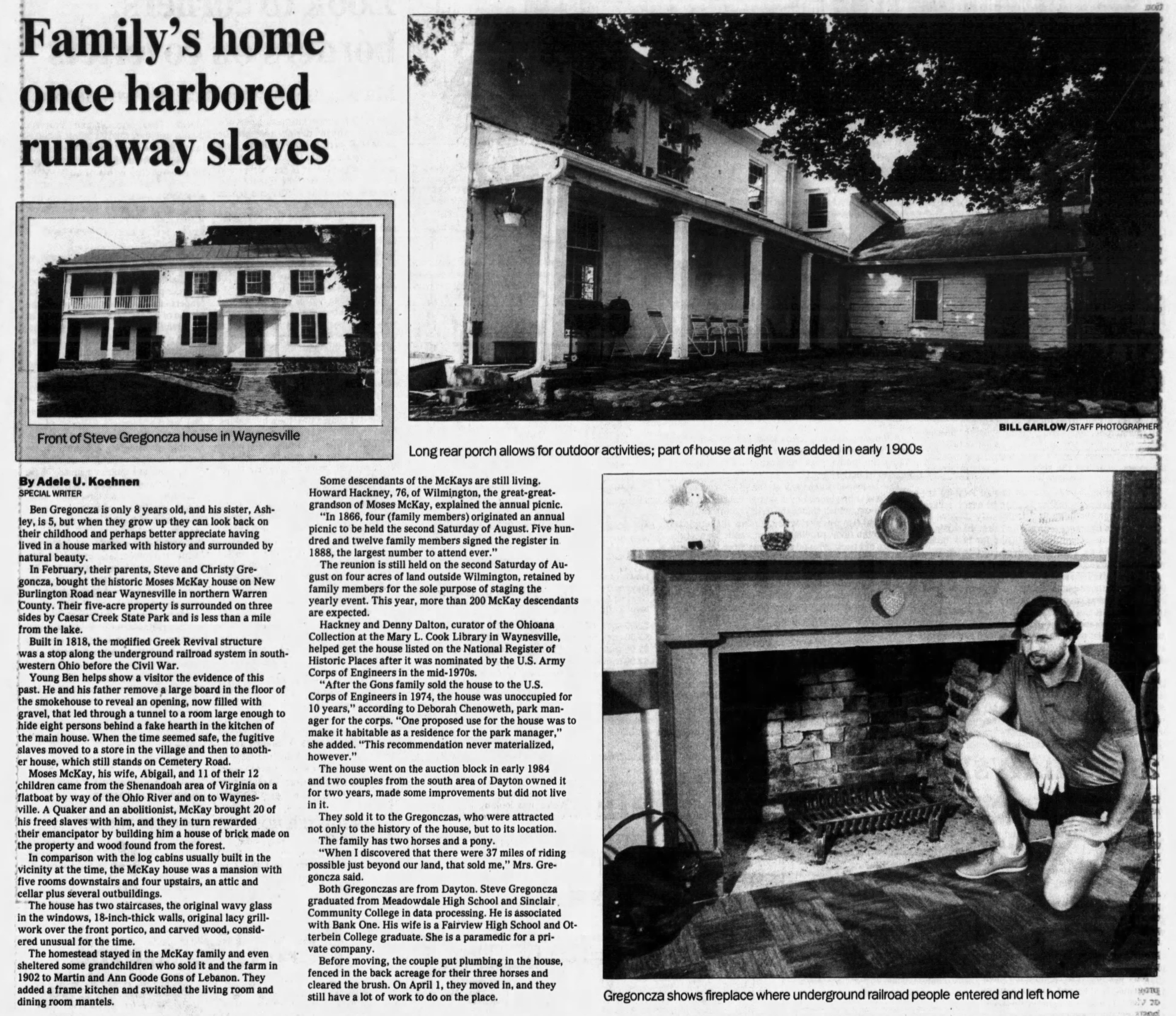 Located in Warren Co. Ohio, it was the home of Moses McKay & Abigail Shinn and was built in 1818 with the help of newly freed slaves brought with Moses and Abigail. It was used during the days of the Underground Railroad to help hide slaves fleeing north. It is currently owned by Howard & Barbara Doster. Howard is a descendant of Moses McKay.