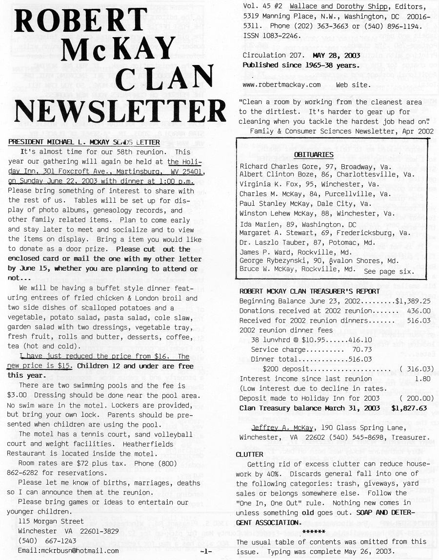 [Home] [Robert Mackay Clan Links and Information]The Robert McKay Clan NewsletterThis Newsletter serves the entire family of Robert Mackay Sr. and some related families. It includes coverage of the Robert McKay Clan Reunion held annually in the Shenandoah Valley of Virginia and the Collett-McKay Picnic held annually in northwestern Clinton County, Ohio. It reports on events and happenings submitted by family members and also contains genealogical information and queries.