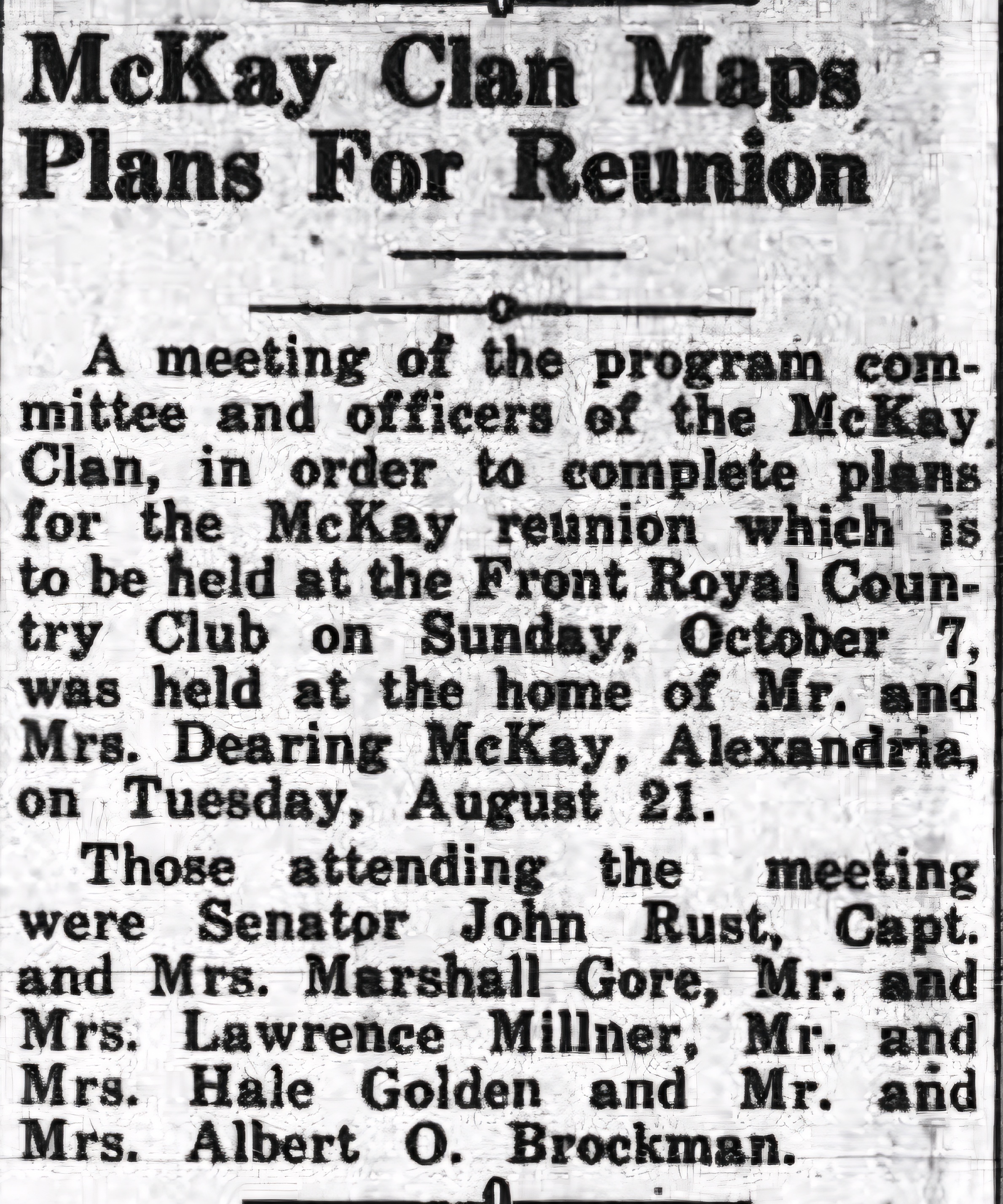 A meeting of the program committee and officers of the McKay clan in order to complete plans for the McKay reunion which is to be held at the Front Royal Country Club on Sunday, October 7, was held at the home of Mr. and Mrs. Dearing McKay in Alexandria on Tuesday, August 21. Those attending the meeting were Senator John Rust, Capt. and Mrs. Marshall Gore, Mr. and Mrs. Lawrence Mill ner, Mr. and Mrs. Hale Golden and Mr. and Mrs. Albert O. Brockman.