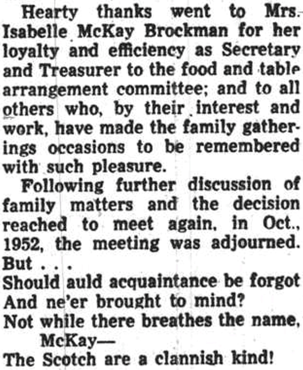 Hearty thanks went to Mrs. Isabelle McKay Brockman for her loyalty and efficiency as Secretary and Treasurer to the food and table arrangement committee; and to all others who, by their interest and work, have made the family gatherings occasions to be remembered with such pleasure.