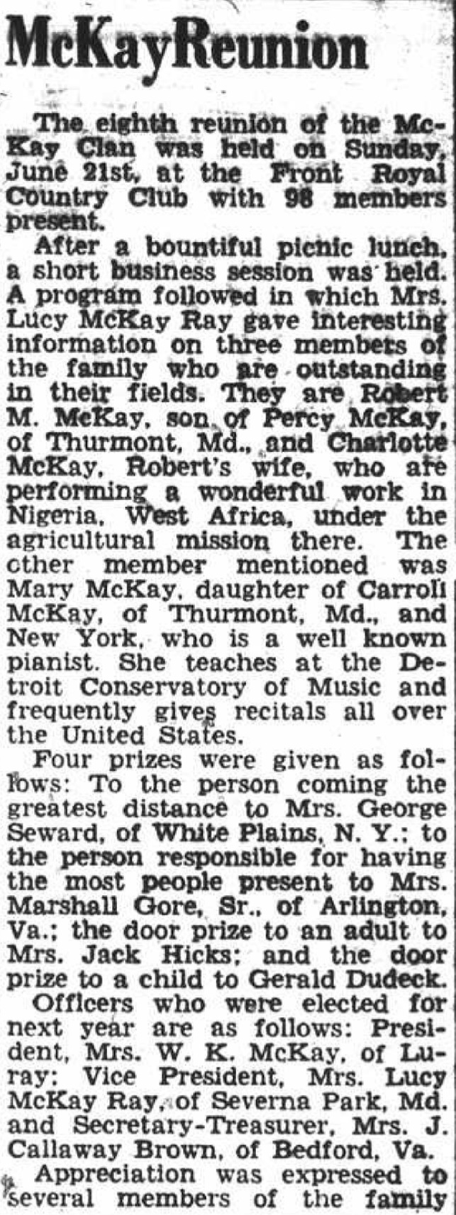 After a bountiful picnic lunch a short business session was held. A program followed in which Mrs. Lucy McKay Ray gave interesting information on three members of the family who are outstanding in their fields. They are Robert H. McKay, son of Percy McKay of Thurmont, and Charlotte McKay, Robert's wife, who are performing a wonderful work in Nigeria, West Africa, under the agricultural mis sion there. The other member mentioned was Mary McKay, daughter of Carrol McKay of Thurmont, Md. and New York, who is a well known pianist. She teaches at the Detroit Conservatory of Music and frequently gives recitals all over the United States.