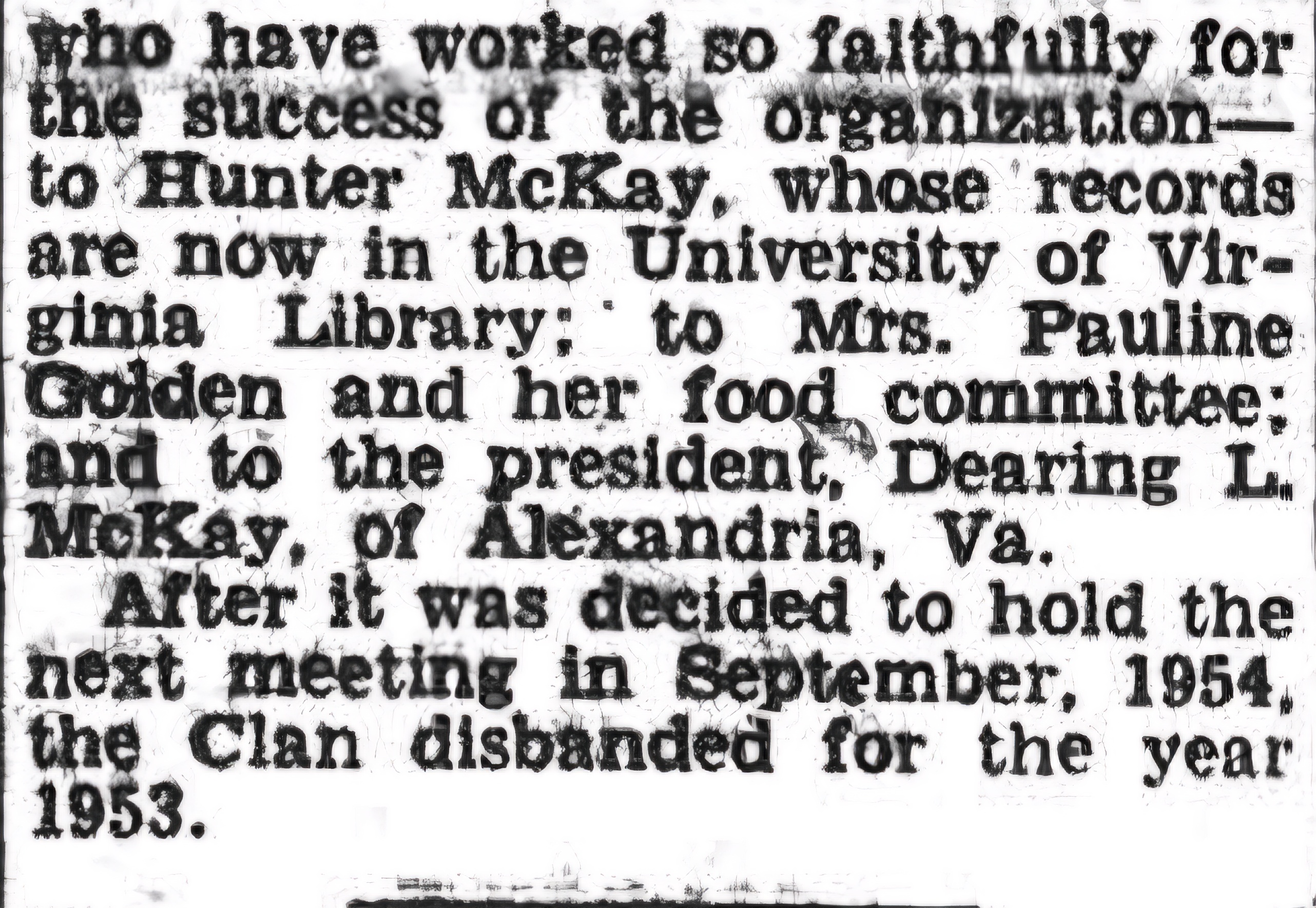 Appreciation was expressed to several members of the family who have worked so faithfully for the success of the organization-to Hunter McKay, whose records are now in the University of Virginia Library; to Mrs. Pauline Golden and her food committee, and to the president, Dearing L. McKay of Alexandria.