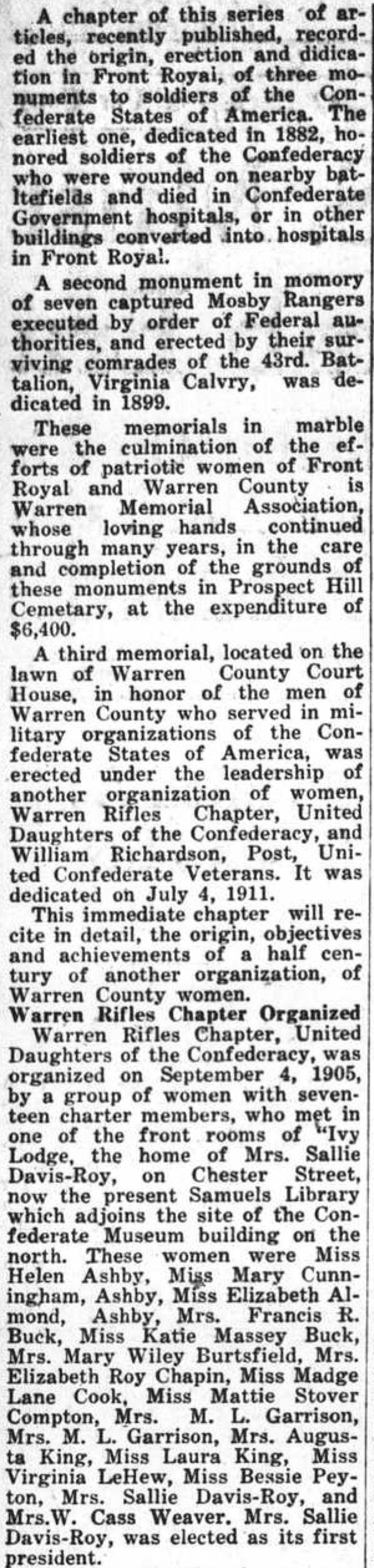 Warren Rifles Chapter, United Daughters of the Confederacy, was organized on September 4, 1905, by a group of women with seventeen charter members, who met in one of the front rooms of "Ivy Lodge", the home of Mrs. Sallie Davis-Roy, on Chester Street, now the present Samuels Library which adjoins the site of the Confederate Museum building on the north. These women were Miss Helen Ashby, Miss Mary Cunningham Ashby, Miss Elizabeth Almond Ashby, Mrs. Francis R. Buck, Miss Katie Massey Buck, Mrs. Mary Wiley Burtsfield, Mrs. Elizabeth Roy Chapin, Miss Madge Lane Cook, Miss Mattie Stover Compton, Mrs. M. L. Garrison, Mrs. Augusta King, Miss Laura King, Miss Virginia LeHew, Miss Bessie Peyton, Mrs. Sallie Davis-Roy, and Mrs.W. Cass Weaver. Mrs. Sallie Davis-Roy was elected as its first president.