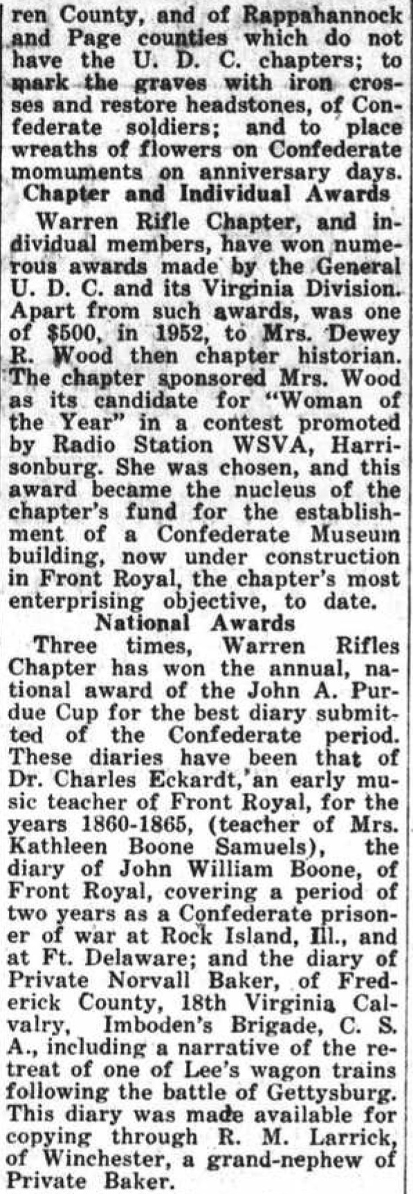 Three times, Warren Rifles Chapter has won the annual, national award of the John A. Purdue Cup for the best diary submitted of the Confederate period. These diaries have been that of Dr. Charles Eckardt, an early music teacher of Front Royal, for the years 1860-1865, (teacher of Mrs. Kathleen Boone Samuels), the diary of John William Boone, of Front Royal, covering a period of two years as a Confederate prisoner of war at Rock Island, Ill., and at Ft. Delaware; and the diary of Private Norvall Baker, of Frederick County, 18th Virginia Cavalry, Imboden's Brigade, C. S. A., including a narrative of the retreat of one of Lee's wagon trains following the battle of Gettysburg: This diary was made available for copying through R. M. Larrick, of Winchester, a grand-nephew of Private Baker.