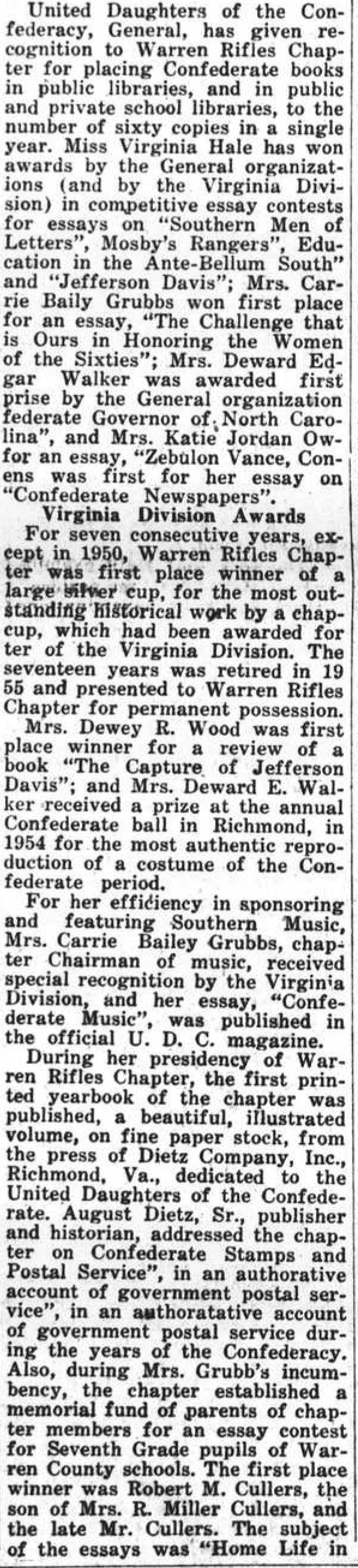 United Daughters of the Confederacy, General, has given recognition to Warren Rifles Chapter for placing Confederate books in public libraries, and in public and private school libraries, to the number of sixty copies in a single year. Miss Virginia Hale has won awards by the General organizations (and by the Virginia Division) in competitive essay contests for essays on "Southern Men of Letters", "Mosby's Rangers", "Education in the Ante-Bellum South" and "Jefferson Davis"; Mrs. Carrie Baily Grubbs won first place for an essay, "The Challenge that is Ours in Honoring the Women of the Sixties"; Mrs. Deward Edgar Walker was awarded first prize by the General organization federate Governor of North Carolina, and Mrs. Katie Jordan Owfor an essay, "Zebulon Vance", Conens was first for her essay on "Confederate Newspapers".