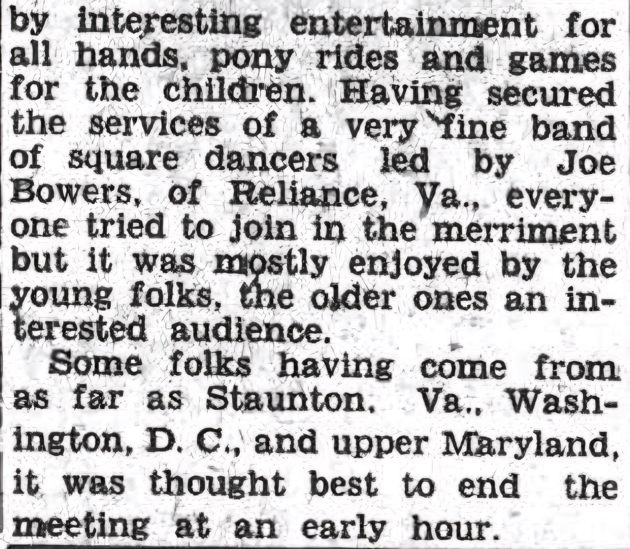 It was decided that another meeting will be held on the second Sunday in August, 1957, the place of the meeting to be decided upon later. The business meeting was adjourned and was followed by interesting entertainment for all hands, pony rides and games for the children. Having secured the services of a very fine band of square dancers led by Joe Bowers, of Reliance, Va., everyone tried to join in the merriment but it was mostly enjoyed by the young folks, the older ones an interested audience.