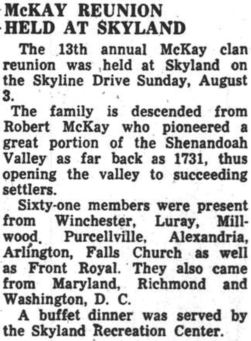 The 13th annual McKay Clan reunion was held at Skyland Recreation Center on Skyline Drive on Sunday, August 3rd. The Clan members are descendents of Robert McKay who pioneered a great portion of the Shenandoah Valley dated as far back as the year of 1731, thus opening the valley to succeeding settlers.
