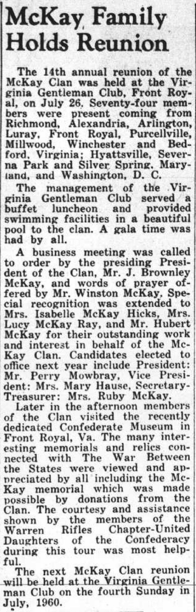 The 14th annual reunion of the McKay clan was held at the Virginia Gentleman Club, Front Royal, on July 26. Seventy-four members were present, guest coming from Richmond, Alexandria, Arlington, Luray, Front Royal, Purcellville, Millwood, Winchester and Bedford, Hyattsville, Severna Park and Silver Spring, Md. and Washington.