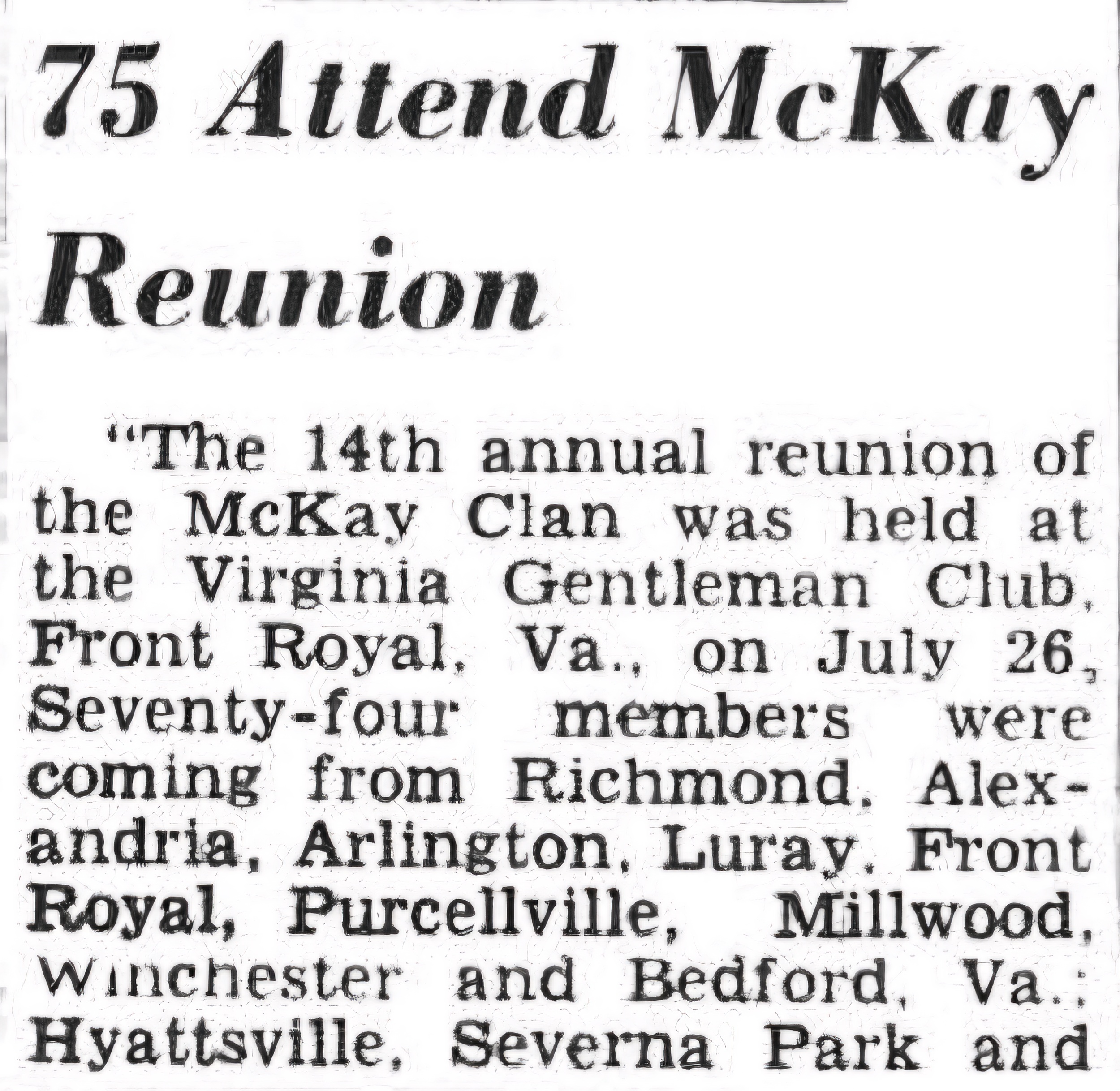 "The 14th annual reunion of the McKay Clan was held at the Virginia Gentleman Club, Front Royal, Va., on July 26, Seventy-four members were coming from Richmond, Alexandria, Arlington, Luray, Front Royal, Purcellville, Millwood, Winchester and Bedford, Va.; Hyattsville, Severna Park and Silver Spring, Md., and Washington, D. C.