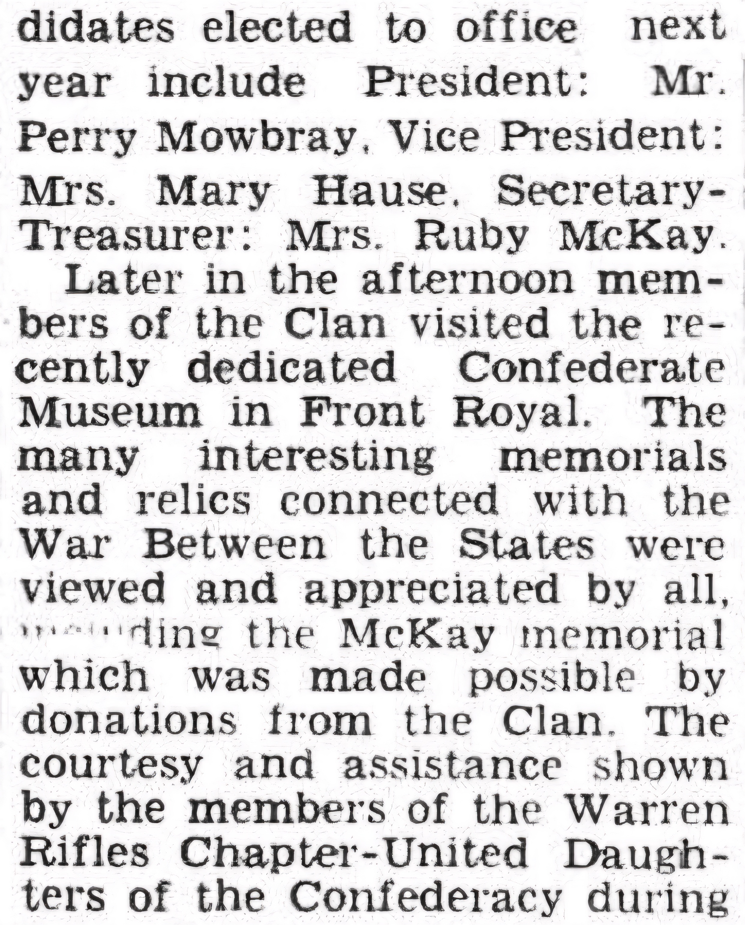 Later in the afternoon, members of the clan visited the recently dedicated Confederate museum in Front Royal. The interesting memorials and relics connected with the War Between the States were viewed, including the McKay memorial, which was made possible by donations from the clan.