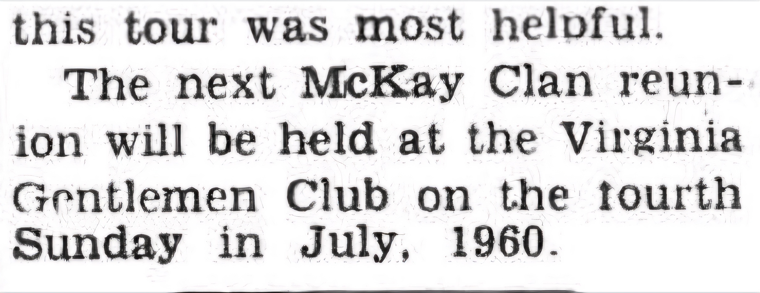 The next McKay clan reunion will be held at the Virginia Gentleman Club on the fourth Sunday in July 1960.