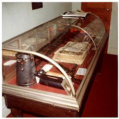 McKay Family Display at Confederate Museum-Front Royal- note the pistol in front of case- It is Navy Colt- ball and percussion 1850 model with original serial number. It was picked up at kitchen door of the old McKay Home by Robert McKay after a battle was over around the home. He was eleven or twelve years old at the time. It was kept in the family and given to Perry D. Mowbray by Mrs. Charles R. McKay, and was lent to the Museum for this display. |