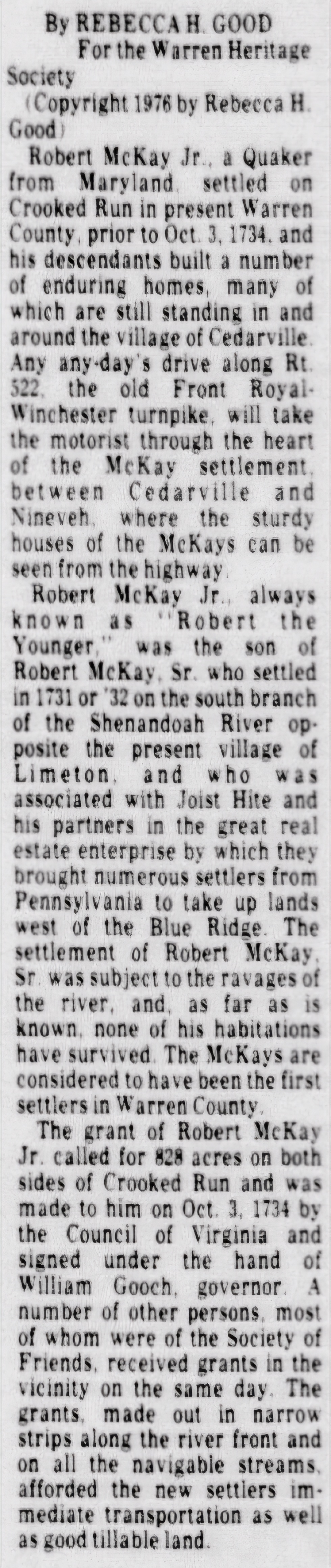 Robert McKay Jr., a Quaker from Maryland, settled on Crooked Run in present Warren County, prior to Oct. 3, 1734, and his descendants built a number of enduring homes, many of which are still standing in and around the village of Cedarville. Any any-day's drive along Rt. 522, the old Front Royal-Winchester turnpike, will take the motorist through the heart of the McKay settlement, between Cedarville and Nineveh, where the sturdy houses of the McKays can be seen from the highway.