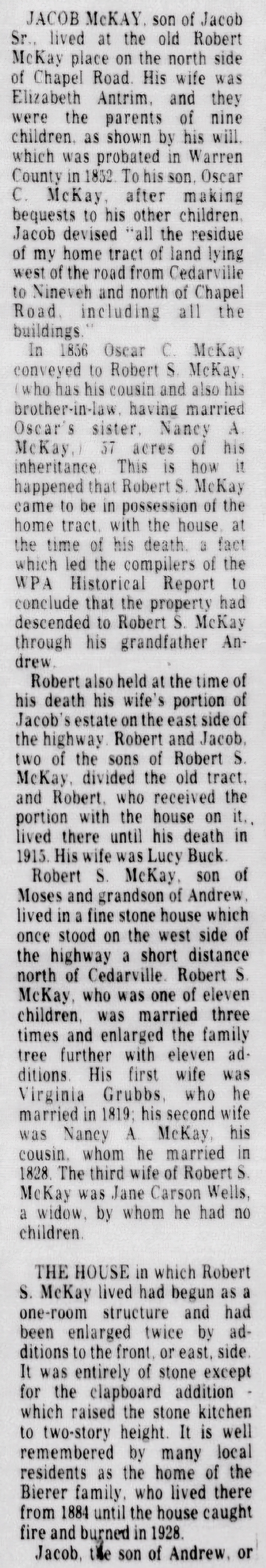 JACOB McKAY, son of Jacob Sr., lived at the old Robert McKay place on the north side of Chapel Road. His wife was Elizabeth Antrim, and they were the parents of nine children, as shown by his will, which was probated in Warren County in 1852. To his son, Oscar C. McKay, after making bequests to his other children, Jacob devised "all the residue of my home tract of land lying west of the road from Cedarville to Nineveh and north of Chapel Road, including all the buildings."
