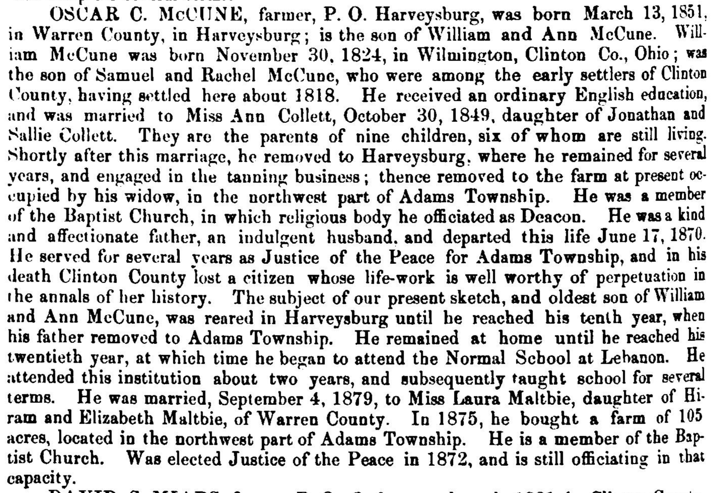 [Home] [Robert Mackay Clan Links and Information] [Memorabilia]Oscar C. McCune & Laura Maltbie ClippingsSee their family record. History of Clinton County, Ohio by Dorothy Carey Toennies, Pliny A. Durant, W.H. Beers & Co. (1882) p. 928 [Previous page] [Next page]© 1997 steer_family@hotmail.com |